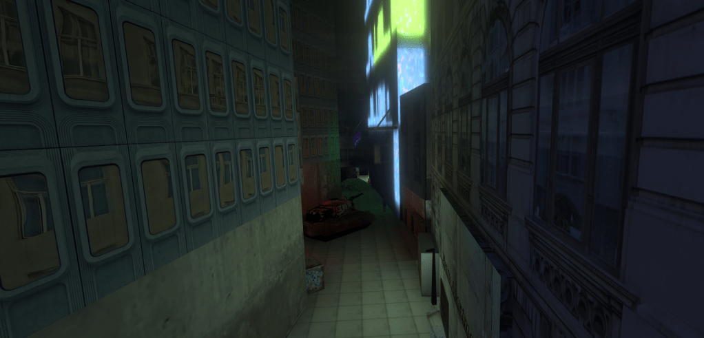 Dark alleys and gloomy industrial areas crawling with soldiers, what more could you want from an Immersive Sim level? I had fun creating a new part of the city, which acts as a “bridge” between two earlier locations in the game. I hope that this gives the player a sense that the game does not just take place in disparate, disconnected areas, but actually there is a feeling that it’s an interconnected city (even though it’s not in practical terms of course!)